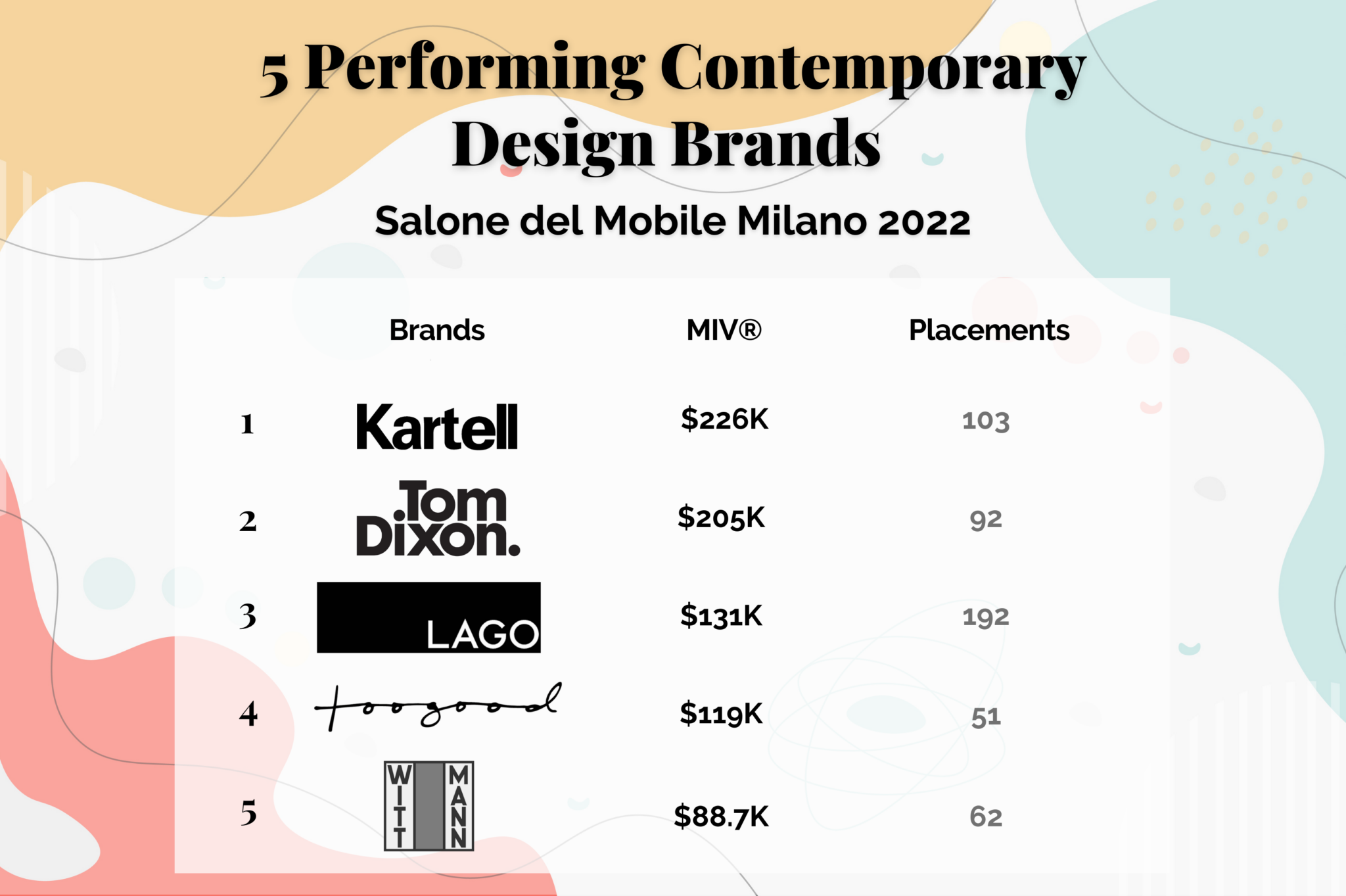 احتلت Wittmann ، وهي علامة تجارية راسخة للأثاث المعاصر لها أكثر من 125 عامًا من التاريخ ، المرتبة الخامسة في تصنيفنا للتصميم خلال Salone del Mobile Milano 2022. في الحدث الذي أقيم في عام 2022 ، حصل Wittmann على إجمالي 70.5 ألف دولار في MIV عبر 50 موضعًا مما يشير إلى جهود لجذب المستهلكين وبناء التواجد في السوق. كانت التغطية عبر الإنترنت للعلامة التجارية قوية بشكل خاص في منطقة أوروبا والشرق الأوسط وإفريقيا ، حيث تأتي غالبية عناصر MIV الخاصة بها من ألمانيا بإجمالي 56.5 ألف دولار في MIV تم إنشاؤه في البلاد.