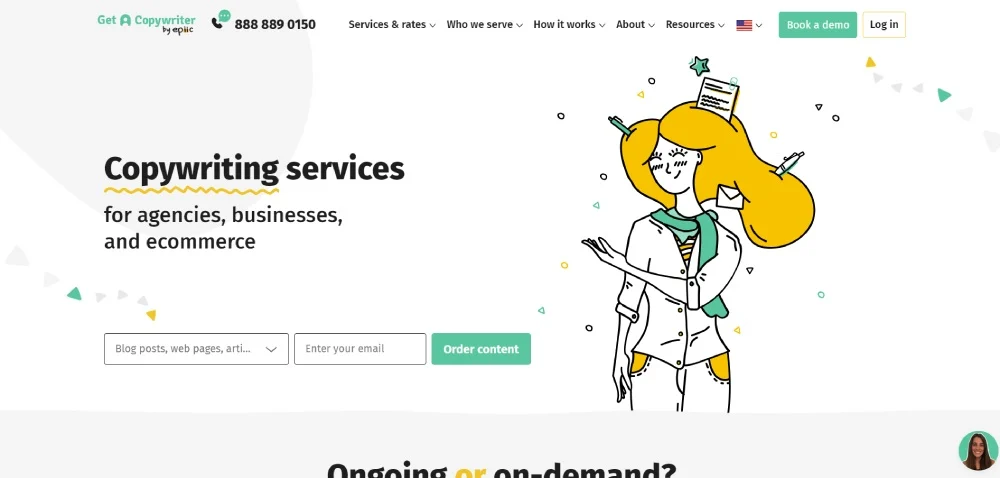 تعد خدمة Get a Copywriter إحدى الخدمات الرائدة التي تلبي جميع احتياجات كتابة الإعلانات الخاصة بك. أنها توفر كتابة النصوص SEO، ونسخة الإعلان، وحملات البريد الإلكتروني، وأكثر من ذلك بكثير! بالإضافة إلى ذلك، فهم متخصصون في مختلف الصناعات، بما في ذلك نمط الحياة والصحة والتمويل والتكنولوجيا والسفر والتعليم والعقارات والمزيد! إذا كنت مهتمًا بالشراكة معهم، فيمكنك الاشتراك أو الحصول على أسعار لأنواع محتوى متعددة أو استئجار كاتب بمساعدة الذكاء الاصطناعي.