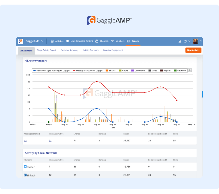 يجعل GaggleAMP من السهل جدًا إعادة تعيين الغرض من المحتوى بشكل فعال. كل ما عليك فعله هو تسجيل الدخول إلى منصة GaggleAMP واختيار "قائمة الأنشطة". من هنا ، يمكنك النقر فوق العناوين لإعادة ترتيب النتائج لعرض أنشطتك حسب "مدى الوصول" وعدد مرات نشرها وإجمالي النقرات التي تلقتها والمزيد.