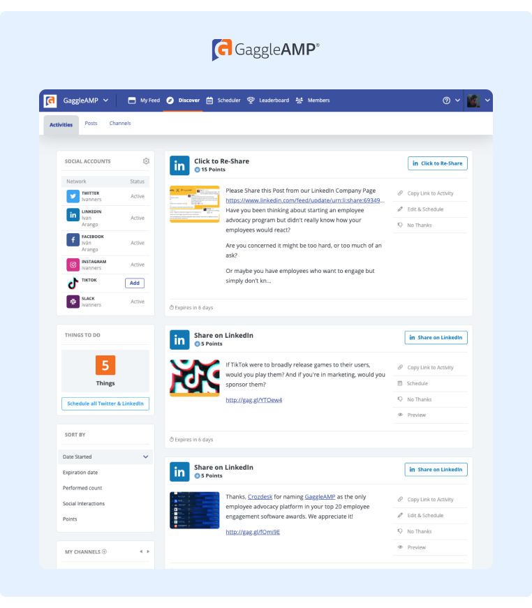 في الواقع ، يقدم GaggleAMP أيضًا لوحة ليدربورد حيث يمكن للشركة بأكملها معرفة من يقوم بالنشر أكثر ، طالما أن العضو قد اختار المشاركة في لوحة المتصدرين. يضيف هذا عنصرًا من عناصر التحفيز الذي يشجع ضغط الأقران الإيجابي على الموظفين للمشاركة.