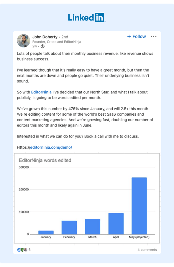 إذا كنت تحاول إشراك المديرين التنفيذيين المشغولين بشكل خاص ولم يكن لديهم الوقت لكتابة المحتوى شخصيًا ، فيمكنك كتابة المحتوى مسبقًا لهم ، وبعد ذلك كل ما عليهم فعله هو تحريره / الموافقة عليه.
