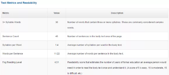 في القسم الثاني من تقرير SPA ، سترى مقاييس خاصة بالنص تساعد في فحص مستوى قراءة المحتوى الخاص بك . ستجد هنا كل شيء بدءًا من عدد الجمل الموجودة في كل صفحة وحتى متوسط عدد المقاطع لكل كلمة في نص الصفحة. يُظهر العمود الأول المقاييس ، بينما يعرض العمود الثاني القيمة ، ويقدم العمود الثالث وصفًا للقيمة حتى تتمكن من فهم الأرقام التي تبحث عنها بشكل أفضل.