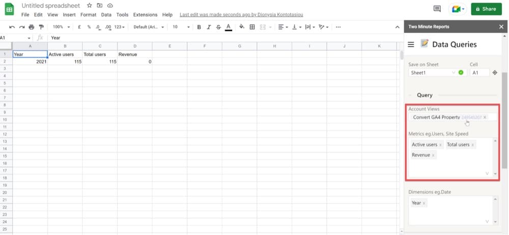 أضف وظيفة Google الإضافية لتقارير دقيقتين إلى جدول بيانات Google ، واستورد مصدر بيانات GA4 حيث توجد بيانات اختبار A / B: