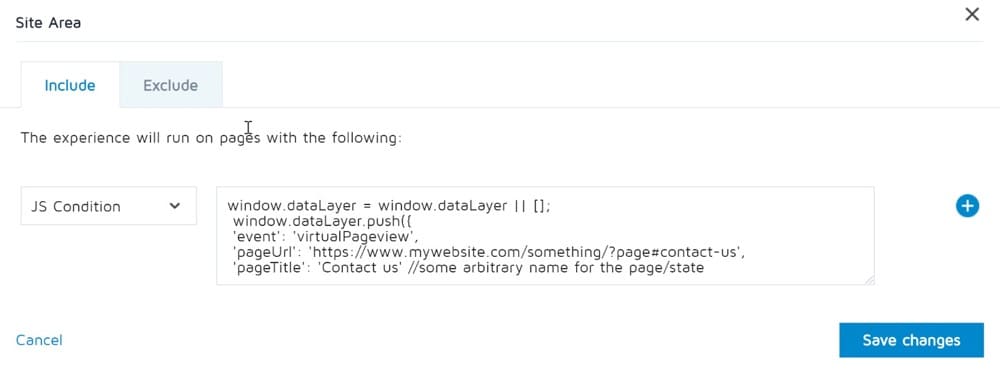 على سبيل المثال ، يمكنك تنشيط رمز dataLayer.push وتجربة التحويل عندما يتنقل المستخدم بين صفحات الويب / حالات موقع الويب / تطبيق الويب.