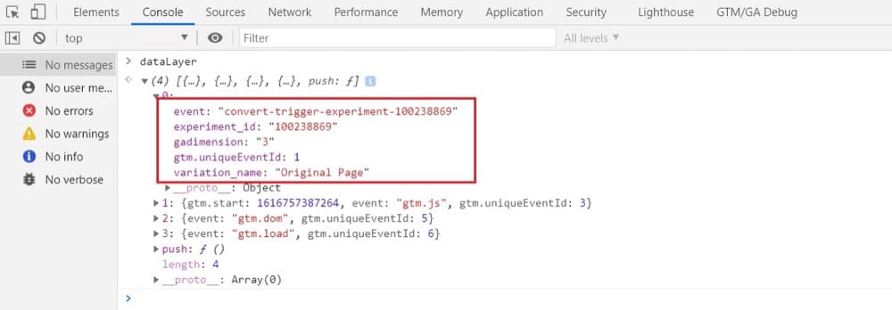 dataLayer.push ({"event": "convert-trigger -perience-1234"، "experience_id": "1234"، "variation_name": "test variation"، "gadimension": "1"}) ؛وإذا كنت تستخدم وحدة تحكم Google Chrome مع ملحق Convert Debugger لتصحيح المشكلات المحتملة ، فهذا ما يبدو عليه الأمر عندما يدفع التحويل البيانات إلى طبقة بيانات GTM: