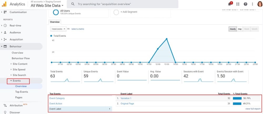 في تقرير الأحداث الخاص بك ، ستجد أيضًا تحويل البيانات التي أرسلناها كحدث في السلوك الأحداث ، تبدو كما يلي: