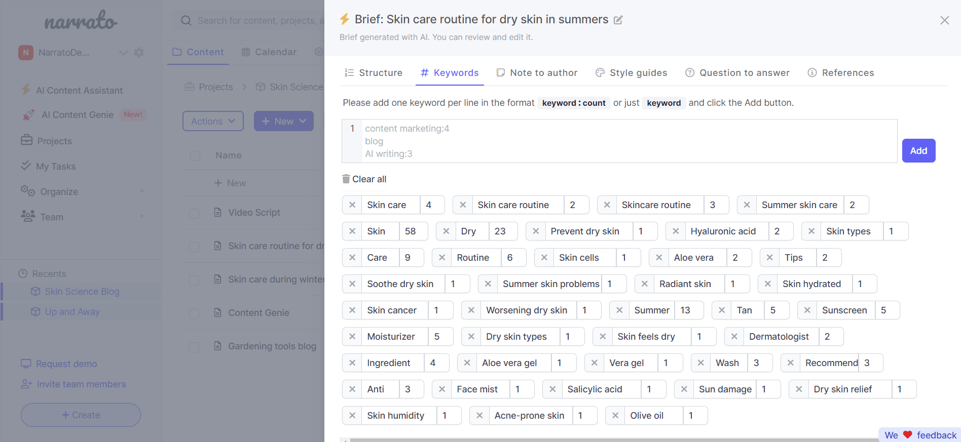 ثم تبدأ في إنشاء المحتوى، ولكن هناك شيء أخير يجب عليك فعله قبل ذلك – وهو تجميع جميع متطلبات تحسين محركات البحث (SEO) الخاصة بك في ملخص شامل. إذا كان مساعد الكتابة المدعم بالذكاء الاصطناعي الخاص بك يحتوي على مولد موجز لتحسين محركات البحث، فيمكن إكمال هذه الخطوة (والتي ستستغرق يدويًا 30 دقيقة على الأقل) في ثوانٍ. يمكنك إثراء ملخص محتوى تحسين محركات البحث (SEO) الذي تم إنشاؤه على Narrato بشكل أكبر عن طريق إضافة المزيد من الكلمات الرئيسية والأسئلة وما إلى ذلك التي تم اكتشافها في بحثك الأولي.