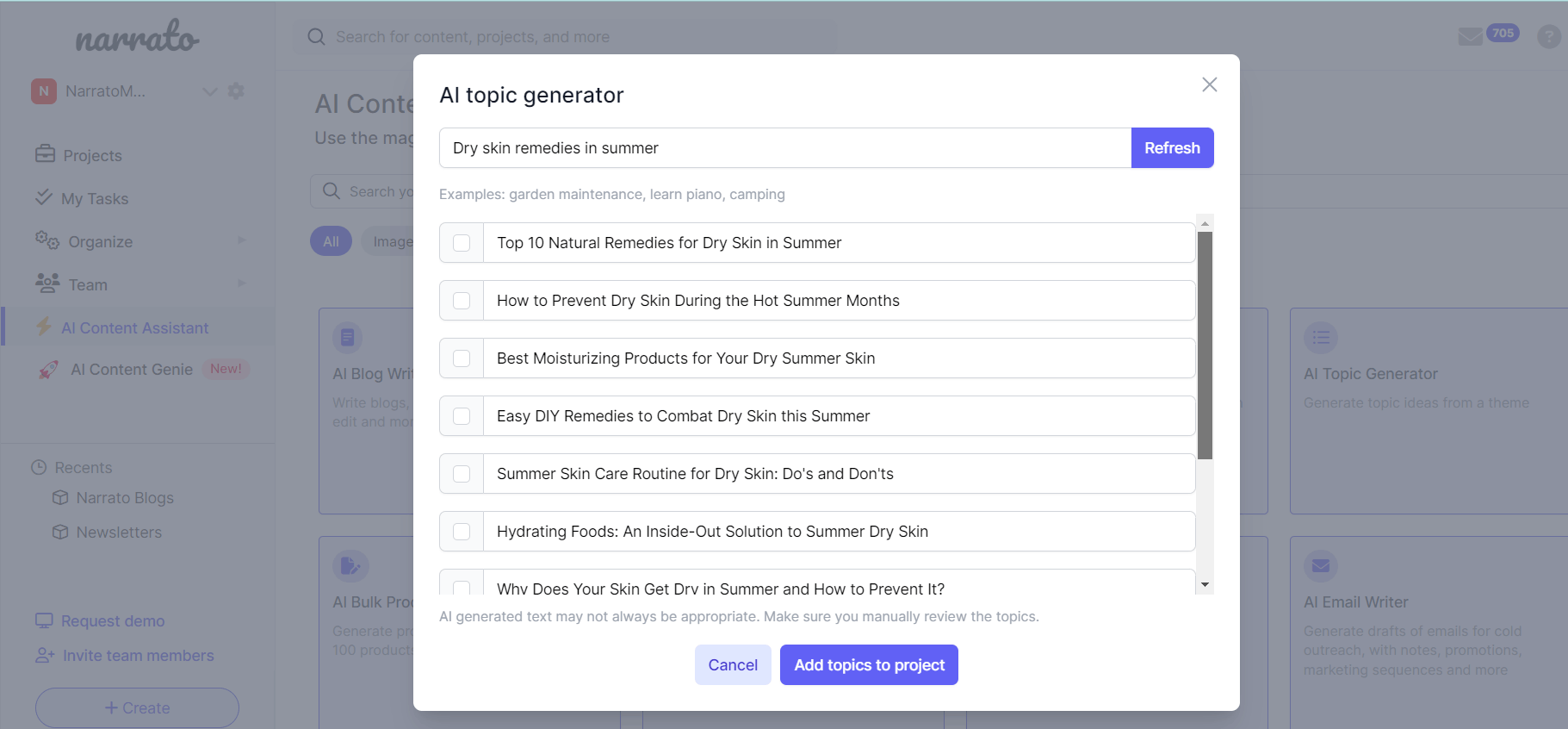 ستكون الخطوة التالية هي إنشاء موضوعات لكلماتك الرئيسية المحددة، ويمكن أن تساعد أداة الكتابة AI SEO في ذلك أيضًا. على سبيل المثال، يمكن لمولد أفكار محتوى الذكاء الاصطناعي في Narrato أن يوفر لك قائمة بأفكار المواضيع بناءً على كلمتك الرئيسية أو موضوعك المستهدف. يمكنك اختيار المواضيع التي تفضلها وإضافتها بسهولة كعناصر محتوى جديدة ضمن المشروع ببضع نقرات.