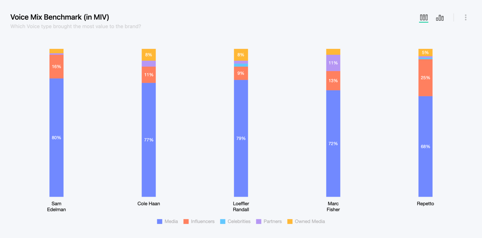 Der Voice Mix ist eine Kennzahl, die den Prozentsatz jeder der fünf Stimmen angibt, die Verbraucher Medien , Influencern , Prominenten , Partnern und eigenen Medien ausgesetzt sind. Der Tarif basiert auf dem gesamten MIV, den jede Stimme für die Schuhmarken generiert hat. Das Bewusstsein für diesen Voice Mix gibt Marken ein besseres strategisches Verständnis für die besten Taktiken für sich selbst oder ihre Konkurrenten .