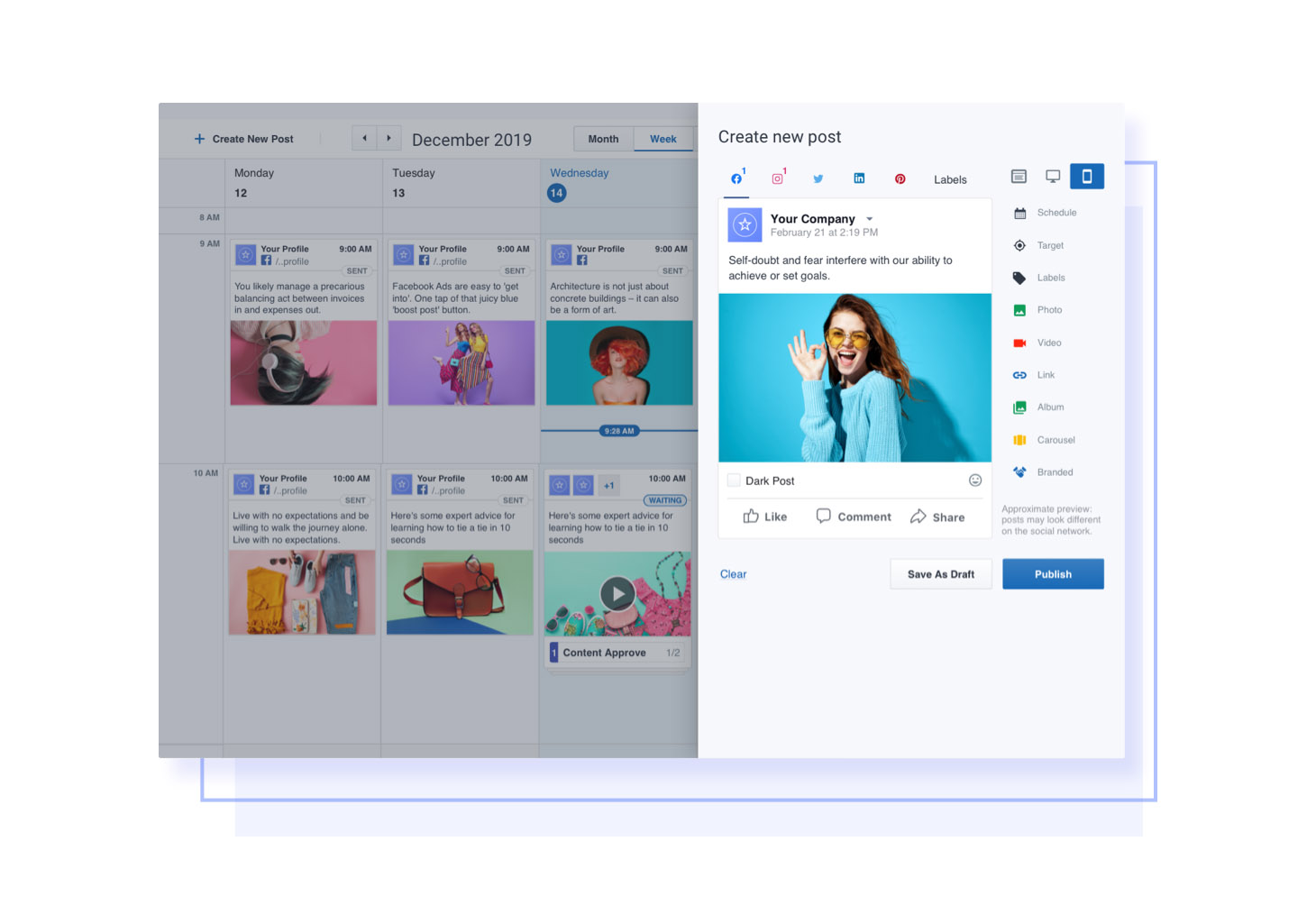 Empfehlungen für die Inhaltsplanung sind auch direkt im Inhaltsherausgeber und im Kalender zugänglich; Wählen Sie beim Planen von Inhalten einfach die sogenannte PrimeTime aus, und die Beiträge werden genau dann veröffentlicht, wenn sie sollten.