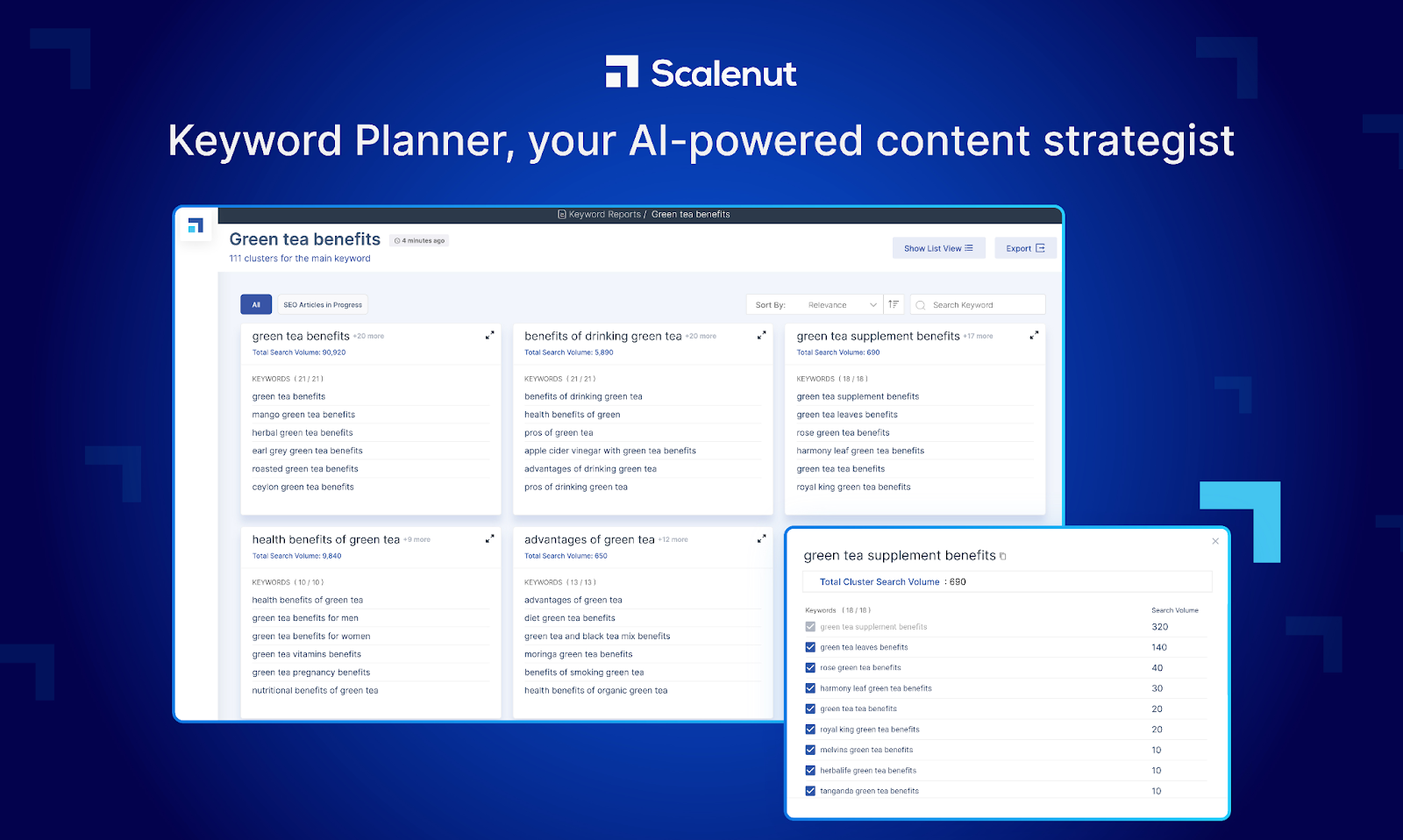 Um das Tool zu nutzen, geben Sie ein Schlüsselwort in den Planner ein, das so spezifisch oder so umfassend wie nötig sein kann. Nachdem Sie Ihren Zielort ausgewählt haben, führt die KI von Scalenut eine eingehende Analyse durch und liefert einen detaillierten Bericht. In diesem Bericht werden die Keyword-Cluster angezeigt, die für Ihr angegebenes Keyword erstellt wurden.