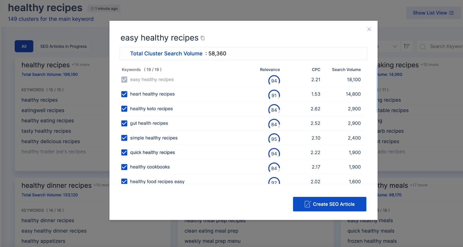 Jeder Cluster kann erweitert werden, um das gesamte Suchvolumen des Clusters, zugehörige Schlüsselwörter und das Suchvolumen für jedes Schlüsselwort anzuzeigen. Es stehen auch Sortieroptionen zur Verfügung, um Cluster nach Relevanz, Suchvolumen oder der Anzahl der Schlüsselwörter innerhalb des Clusters zu organisieren. Zur bequemen Suche nach Schlüsselwörtern in den Clustern ist eine Suchfunktion enthalten.
