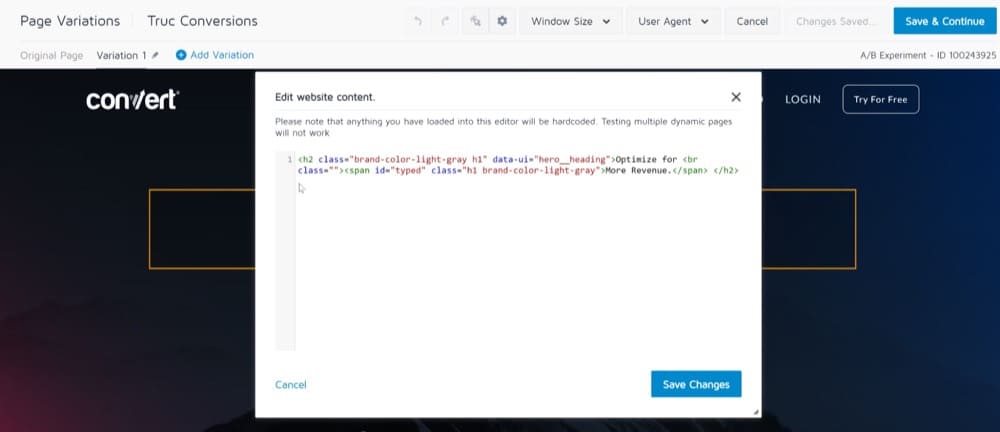 Erweiterte Änderungen für A/B-Tests mit der Option „HTML bearbeiten“ vornehmen - Klicken Sie auf Änderungen speichern.