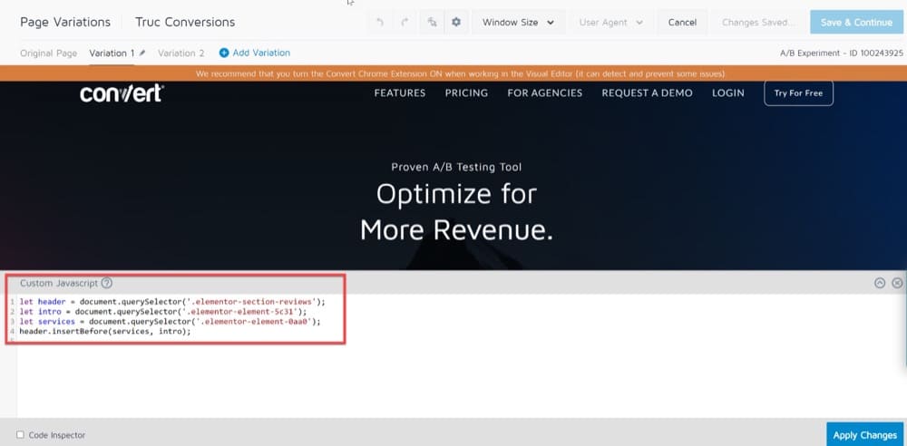 Diese Innovation im Webdesign hat jedoch immer noch ihre Grenzen, und benutzerdefinierte Codierung kann besser geeignet sein, um beispielsweise CSS-Selektoren zu verwenden, um mehrere ähnliche Elemente gleichzeitig zu ändern, eine externe JavaScript-Datei als Teil einer Variation zu laden und einzigartige benutzerdefinierte Ereignisse zu verfolgen .