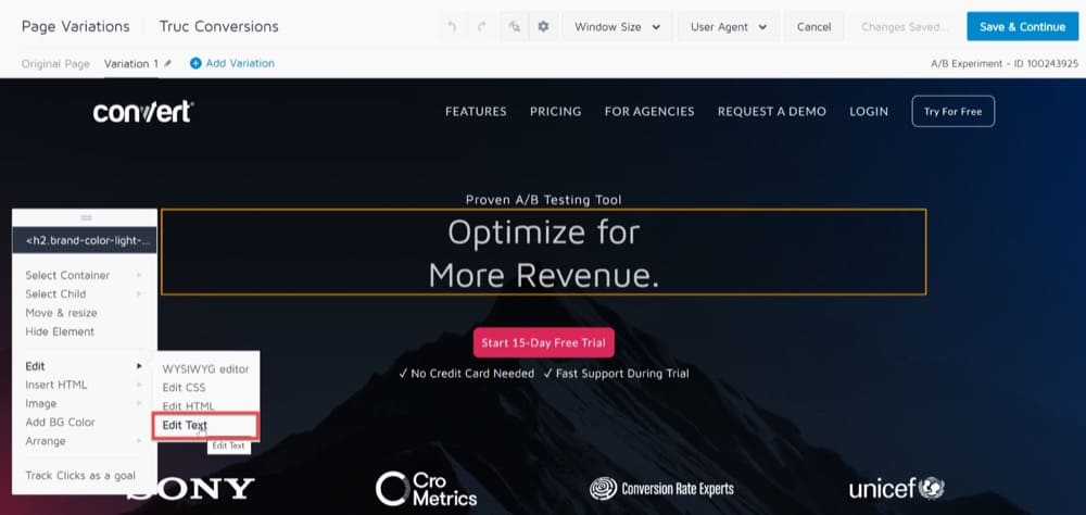 Mit dem visuellen Editor von Convert können Sie in wenigen Minuten neue Textteile hinzufügen und bei Bedarf aktualisieren. Sie können dann die Ergebnisse Ihrer Variationsseiten mit der Originalseite vergleichen, um festzustellen, welche für Ihr Publikum am effektivsten ist. Wenn Sie im Editor Inline-Textanpassungen vornehmen, verwenden Sie die Option „Text bearbeiten“.