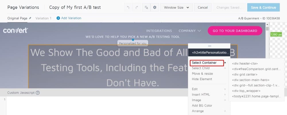Viele Erfahrungen testen nur eine einzelne Seite, daher sind fortgeschrittene Bearbeitungstaktiken nicht erforderlich. In diesen Fällen können Sie den WYSIWYG-Editor (What You See Is What You Get) von Convert verwenden, der die einfachste Möglichkeit zum Erstellen eines A/B-Tests darstellt.