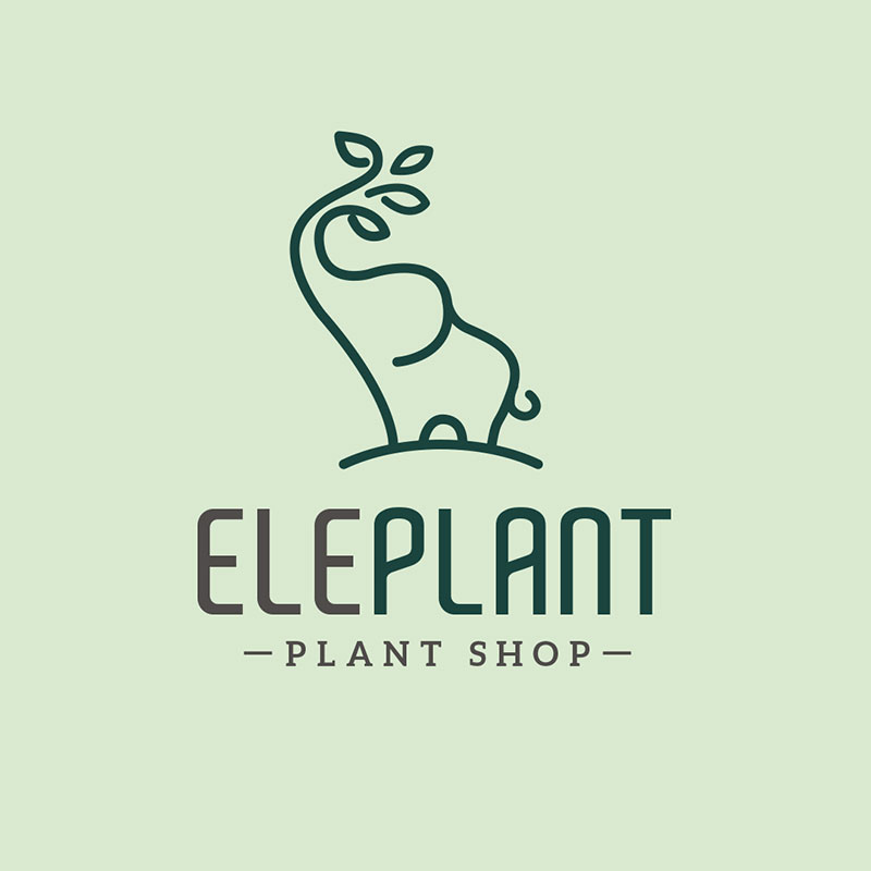 Ein weiterer Markenname, der den Begriff Elefant enthält, ist ElePlant Plant Shop. Dieses wunderschön gestaltete Logo zeigt einen Elefanten, der anmutig seinen Rüssel mit Blättern darauf hebt. Und natürlich verwendet es verschiedene Grüntöne als Primärfarbe, da es allgemein mit Bäumen und der Natur im Allgemeinen in Verbindung gebracht wird .