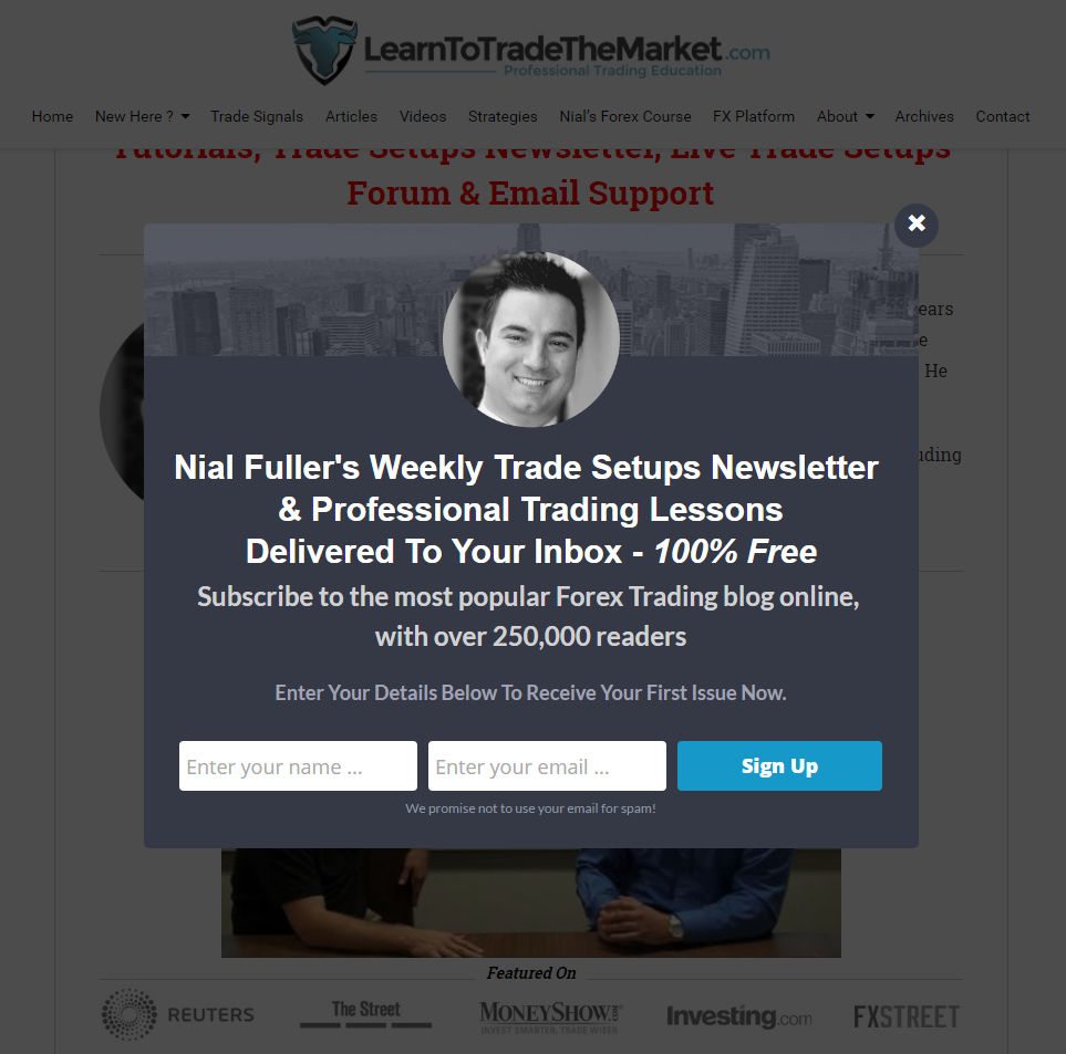 Sehen Sie sich an, wie Nial Fuller eine Squeeze-Page nutzt, um E-Newsletter-Anmeldungen zu fördern, indem er verspricht, kostenlos professionellen Trading-Unterricht zu geben: