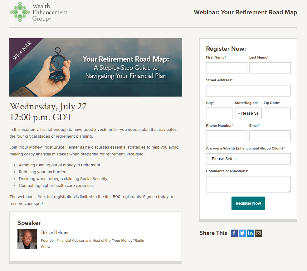 Sie verwenden Aufzählungszeichen, um schnell die Vorteile der Registrierung für das Webinar zu vermitteln, enthalten den Namen, das Porträt und den Titel des Redners, um Autorität zu demonstrieren, und den Ausdruck „Schritt für Schritt“, um zu implizieren, dass die Zuschauer einen nachvollziehbaren Weg lernen, ihre Finanzen zu steuern planen.