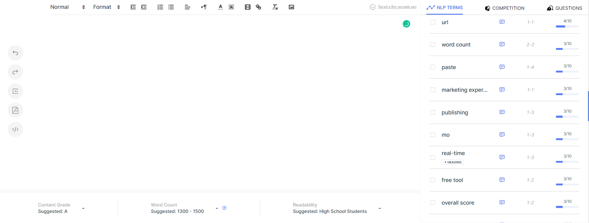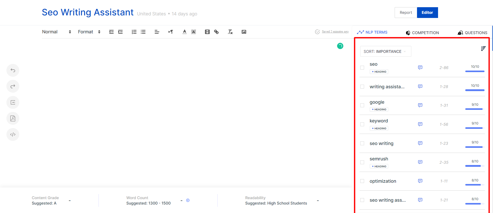 Mit dem SEO-Assistenten können Sie Ihre Inhalte überprüfen und anhand der Inhaltsbewertungsmetriken mit anderen vergleichen. Der SEO-Assistent bietet einen Online-Texteditor, der die gleiche Oberfläche wie Google Docs hat.