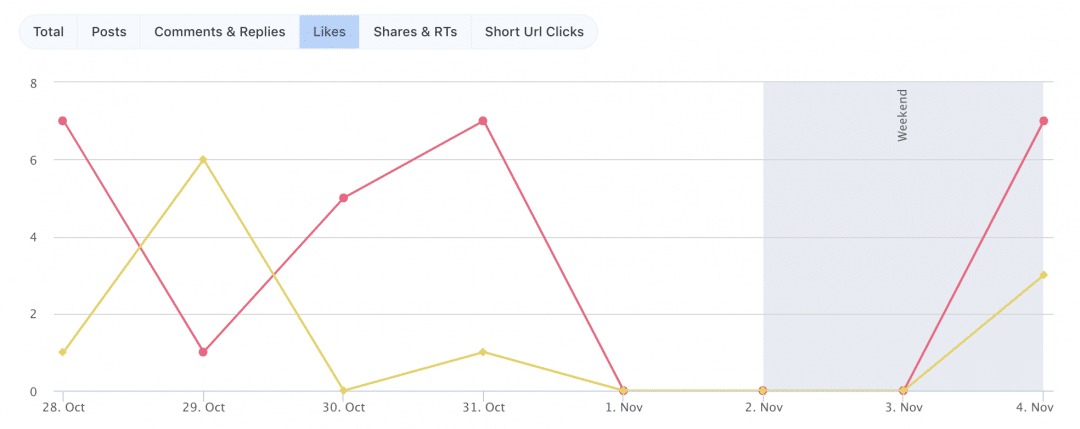 - Interaktion/Engagement „Community“ – „Interaktionen“ listet die folgenden Zahlen für jeden Kanal auf: Anzahl der Posts Ihrer Community, Kommentare und Antworten, Likes, Shares und Retweets und Short-URL-Klicks. Speziell für Facebook haben Sie auch die Möglichkeit, sich die Klickrate anzeigen zu lassen.