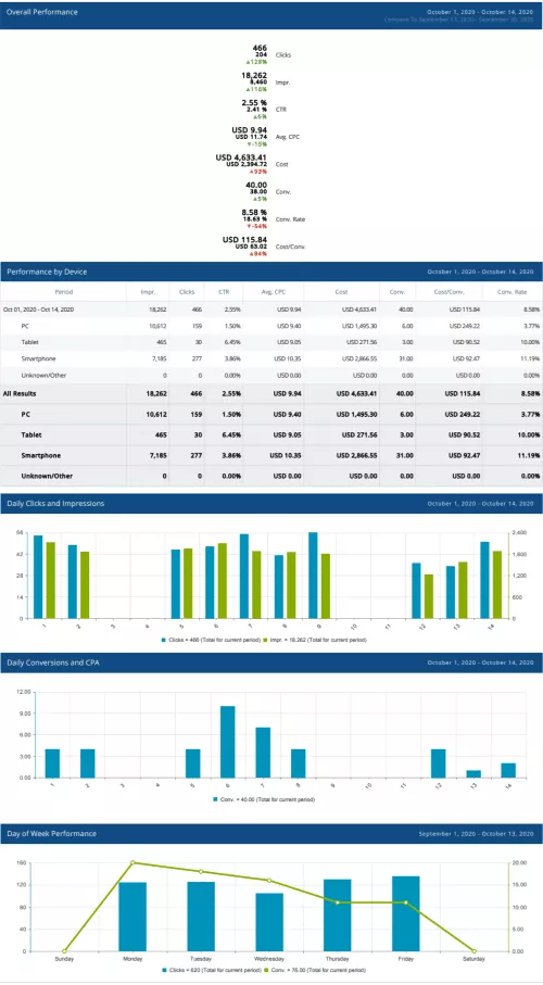 Wenn letzteres der Fall ist, lautet die nächstbeste Frage, die Sie einer potenziellen PPC-Agentur stellen sollten: Wie werden wir kommunizieren? Ein Bericht nur mit Diagrammen und Zahlen kann in Ordnung sein, wenn darauf Besprechungen folgen, die den Fortschritt besprechen. Aber ich möchte erwähnen, dass echte Experten mit beidem zufrieden sind, und der Bericht sollte keine Krücke sein.