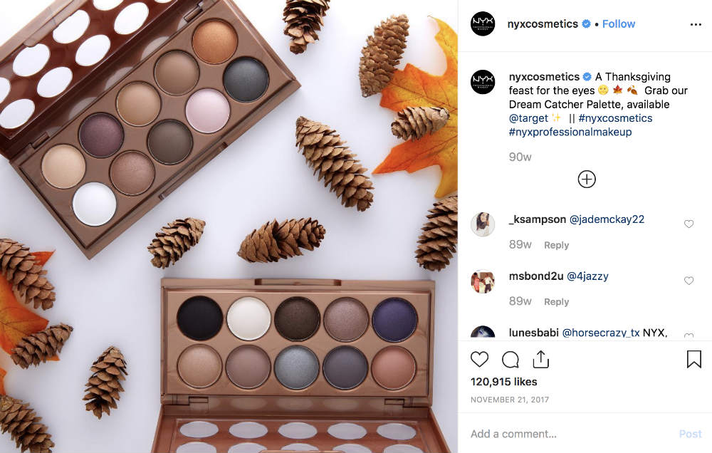 Jetzt ist es unerlässlich, mindestens ein paar dieser Elemente einzubeziehen, damit Ihre Thanksgiving-Marketinganzeigen glänzen. Sie können auch Kürbisse oder einige Herbstblätter hinzufügen, genau wie Nyx Cosmetics es mit ihrem Thanksgiving-Social-Media-Beitrag getan hat.