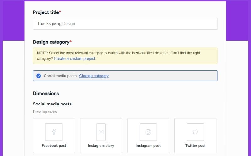 Suchen Sie die Schaltfläche Neues Projekt, die sich auf der rechten Seite des Bildschirms befindet. Von dort aus beantworten Sie einige Fragen, damit der Designer Ihre Idee für das Projekt kennt. Fügen Sie alles hinzu, was ihnen helfen würde. Zum Beispiel Ihre Markenfarben, Ihr Logo, Ihre Website und sogar einige Links zur Inspiration. Einfach gesagt, seien Sie so detailliert wie möglich.
