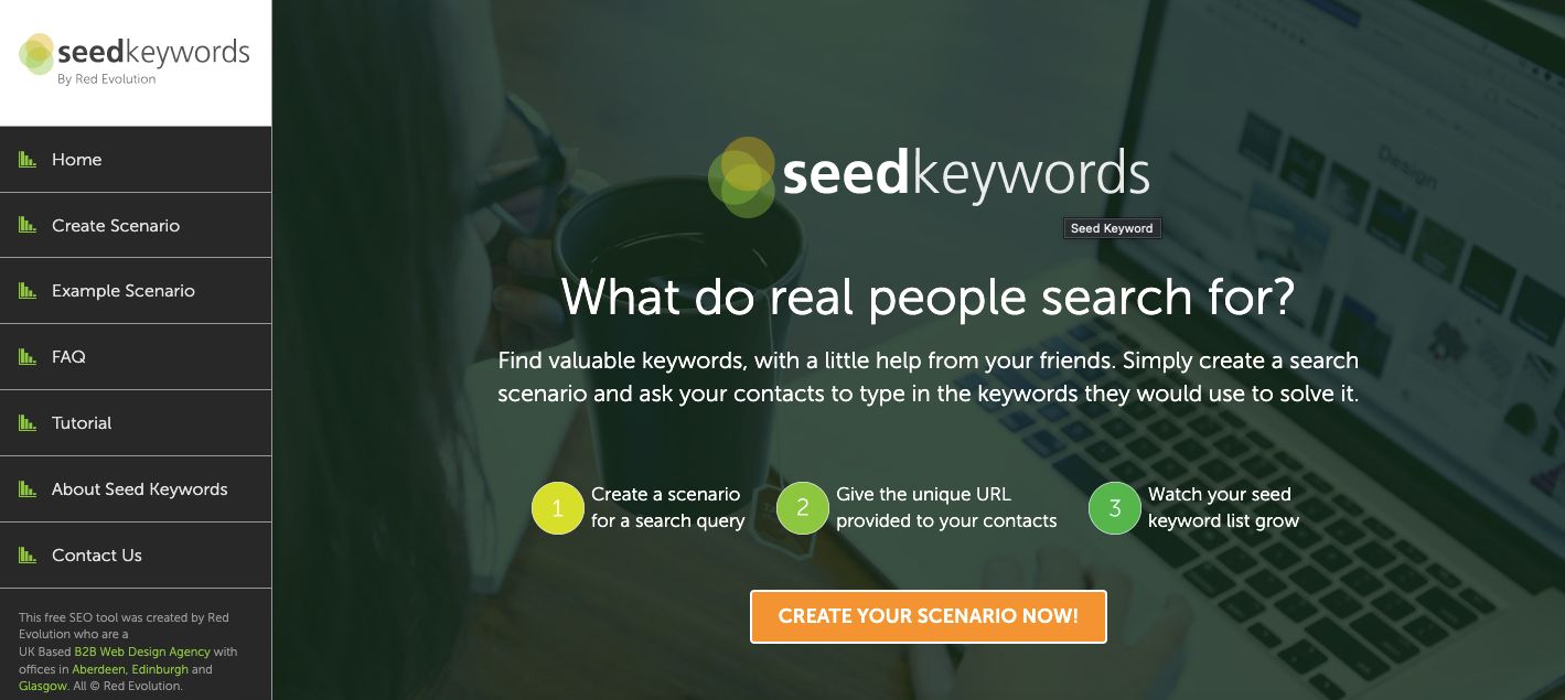 Dies ist ein kostenloses SEO-Tool, das von Red Evolution, einer in Großbritannien ansässigen Webdesign-Agentur, entwickelt wurde. Dieses Keyword-Recherche-Tool funktioniert etwas anders, da Sie damit eine Liste mit Start-Keywords erstellen können, indem Sie Ideen direkt von Ihrem Publikum einholen.
