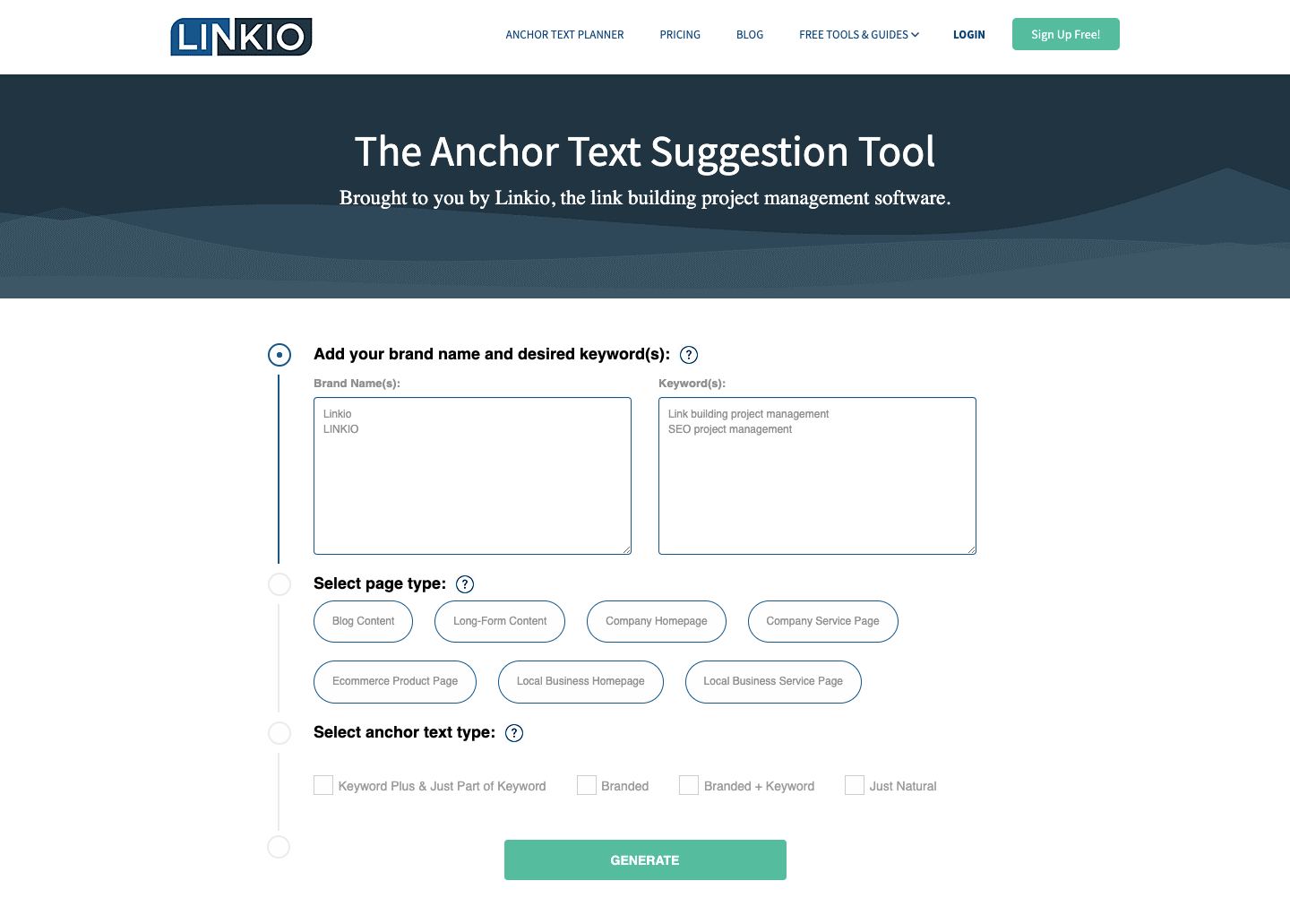 Linkio ist ein Cold-Outreach-Tool, das über Ankertextgenerierungs- und Planungsfunktionen verfügt, um Sie bei Ihren Linkbuilding-Bemühungen zu unterstützen. Der Ankertextplaner hilft Ihnen dabei, die wirkungsvollsten Ankertexte für Ihre SEO-Content-Strategie zu identifizieren. Es wird Ihnen dabei helfen, ein abgerundetes Backlink-Profil zu erstellen, das aus 13 verschiedenen Arten von Ankertexten besteht. Außerdem erhalten Sie Vorschläge für die Priorisierung von Ankertexten und die optimale Reihenfolge für deren Erstellung.