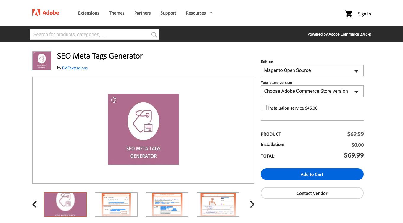 Dies ist ein SEO-Meta-Tag-Generator, der von FMEextension entwickelt und auf der Adobe Magento-Plattform angeboten wird. Mit diesem Tool können Sie die Erstellung von Metadaten automatisieren und SEO-freundliche Meta-Tags für Kategorien, Produkte und CMS-Seiten in der Hälfte der Zeit und mit minimalem Aufwand generieren.