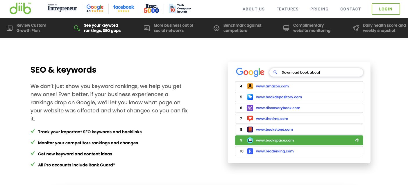 Diib bietet Ihnen nicht nur die Möglichkeit, die Rankings Ihrer Mitbewerber zu verfolgen, sondern verfügt auch über eine einzigartige Rank Guard-Funktion, mit der Sie die Rankings Ihrer Ziel-Keywords verfolgen und überwachen können. Das Tool benachrichtigt Sie, wenn sich Ihr Keyword-Ranking ändert, und teilt Ihnen auch mit, warum es sich geändert hat.