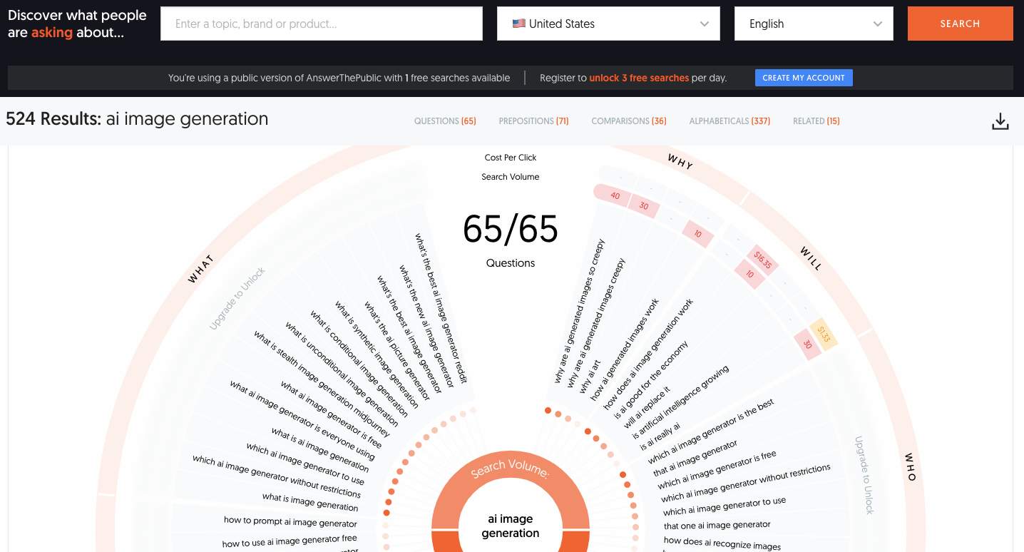 Answer The Public ist ein weiteres kostenloses Tool zur Keyword-Recherche, das Marketingfachleuten dabei helfen kann, die Suchabsichten ihrer Zielgruppe zu verstehen. Dieses Tool kann sowohl bei der Keyword-Recherche als auch bei der Ideenfindung für Inhalte sehr hilfreich sein, da es Ihnen genau sagt, wonach Ihre Zielgruppe sucht. Content-Ideen werden durch automatische Vervollständigung erfasst.