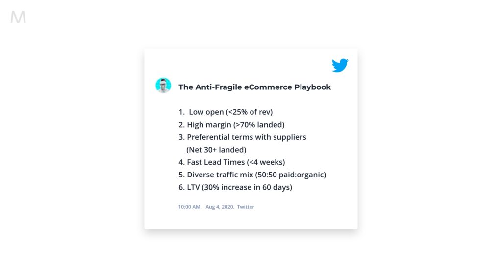Resulta que estos puntos funcionan tanto en el momento en que se escribió esto (agosto de 2020) como ahora, cuando nuestro panorama comercial se ve muy diferente. Esto es lo que Taylor llama un libro de jugadas de comercio electrónico anti-frágil: