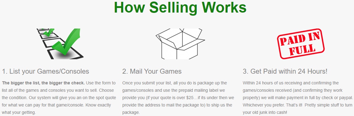 Además, ofrecen etiquetas de envío gratis y pago de un día a través de PayPal o cheque comercial. También le otorgan un bono del 20% si cambia sus juegos por crédito de la tienda en lugar de pago en efectivo.