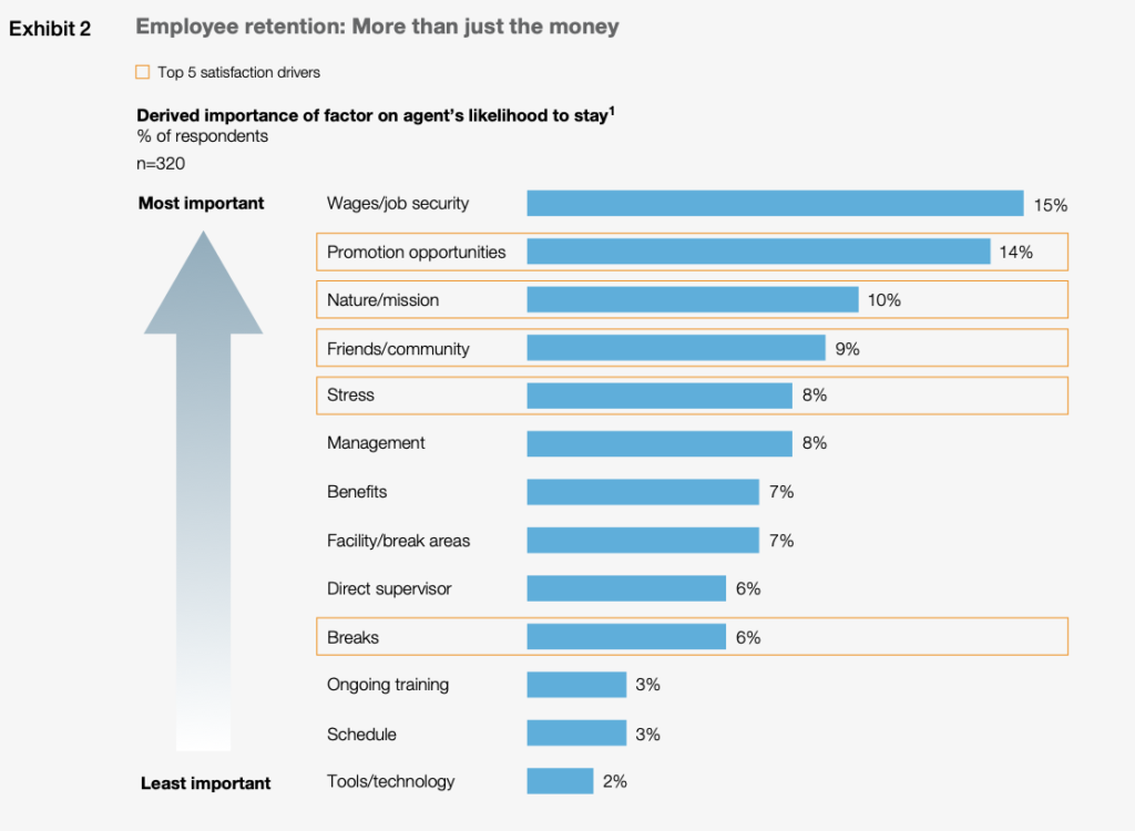 Según una encuesta de McKinsey a empleados de centros de contacto, las oportunidades de promoción representan el 14 % de la satisfacción de un empleado. Eso es superado solo por los salarios.