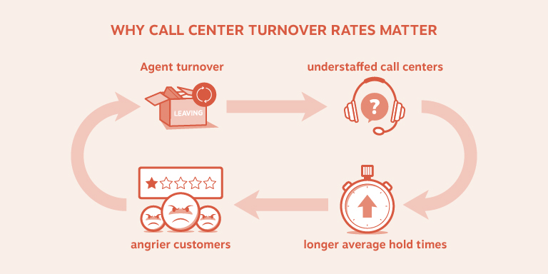 La rotación de agentes conduce a centros de llamadas con personal insuficiente, lo que conduce a tiempos de espera promedio más prolongados, lo que genera clientes más enojados y más agentes que se van.