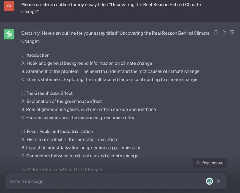 Si no estás acostumbrado a escribir ensayos toda tu vida y esta tarea es un gran desafío, puedes pedirle a ChatGPT que escriba un ensayo de muestra para inspirarte. Sin embargo, no se recomienda utilizar un ensayo generado por IA, ya que podría marcarse como contenido plagiado. Sin embargo, lo que puedes hacer es comprobar el formato y la estructura del ensayo para saber cómo elaborar el tuyo propio. También puedes utilizar este ensayo escrito por IA como inspiración para elegir el mejor ángulo para tu tema.