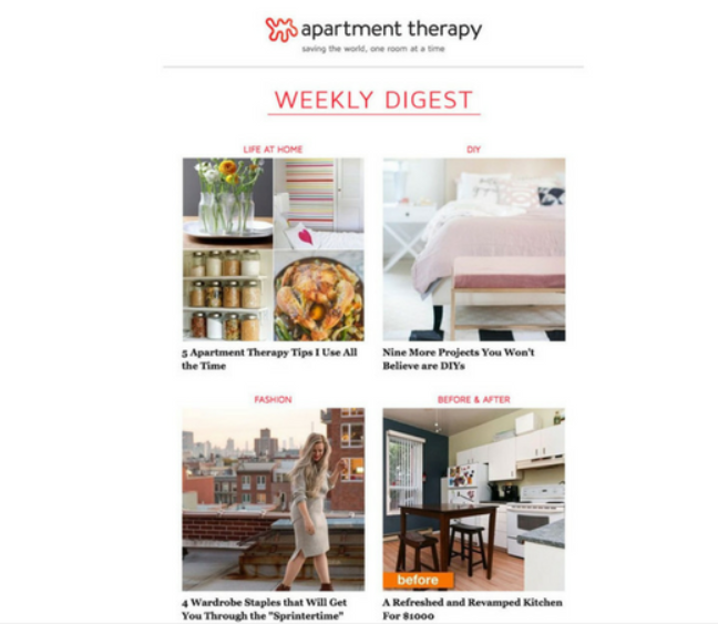 Conseguir que la gente se suscriba es una cosa, mantenerlos suscritos y llamar la atención en su bandeja de entrada es otra. Y una gran parte de esto es elegir contenido que atraiga de inmediato la atención de un destinatario específico y, al mismo tiempo, sea relevante para sus intereses. Vea cómo Apartment Therapy hace esto:
