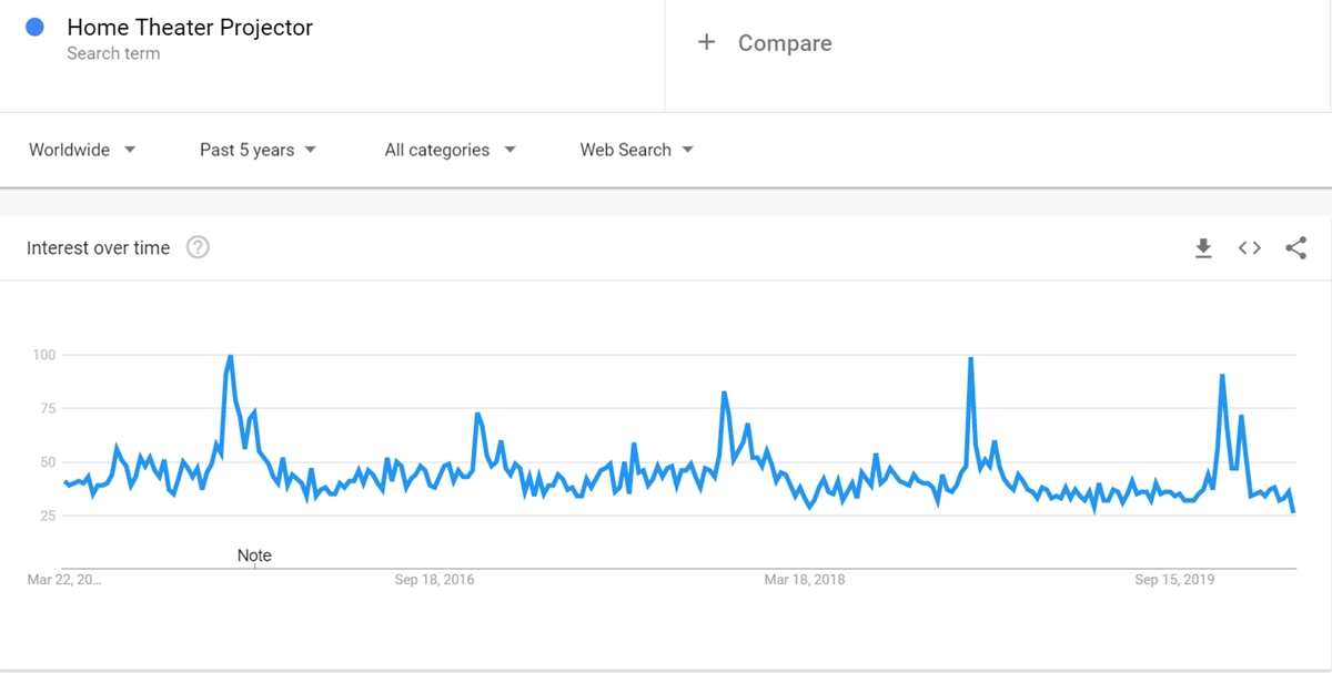 Un proyector de cine en casa es la elección correcta que puede vender para obtener una gran ganancia durante todo el año. Nada puede unir a una familia como una gran película, un divertido programa de televisión o un emocionante partido de eliminatoria en un acogedor cine en casa. Esa es la razón por la que este producto está atrayendo cada vez más la atención cada año en las tendencias de Google.