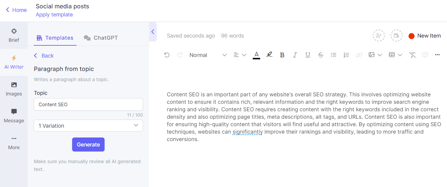 Narrato's AI writing assistant has some very handy use cases that can help you repurpose content faster and more efficiently. Use cases like 'Paraphrase a Paragraph', 'Paragraph from Outline/Topic', 'Paragraph to Bullets', etc. can be of great help. If you are repurposing a blog post for social media, all you have to do is provide an outline of your article and the tool will generate a short paragraph from it within minutes. Or if you wish to condense a key paragraph from your content into bullet points to share on social or online communities, you can use the paragraph to bullets use case.