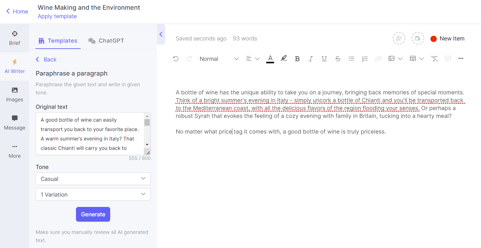Narrato es un espacio de trabajo de contenido de IA completo y su asistente de escritura de IA de última generación tiene múltiples casos de uso para resumir y parafrasear contenido. Las funciones de paráfrasis de contenido de IA de Narrato incluyen casos de uso como 'Parafrasear un párrafo', 'Párrafo a viñetas', 'Mejorador de contenido' y 'Párrafo del esquema'.