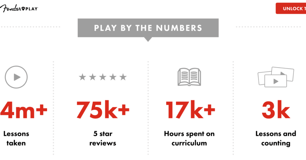 Fender Play, un servicio de enseñanza de guitarra en línea, proporciona su prueba social con la siguiente infografía.