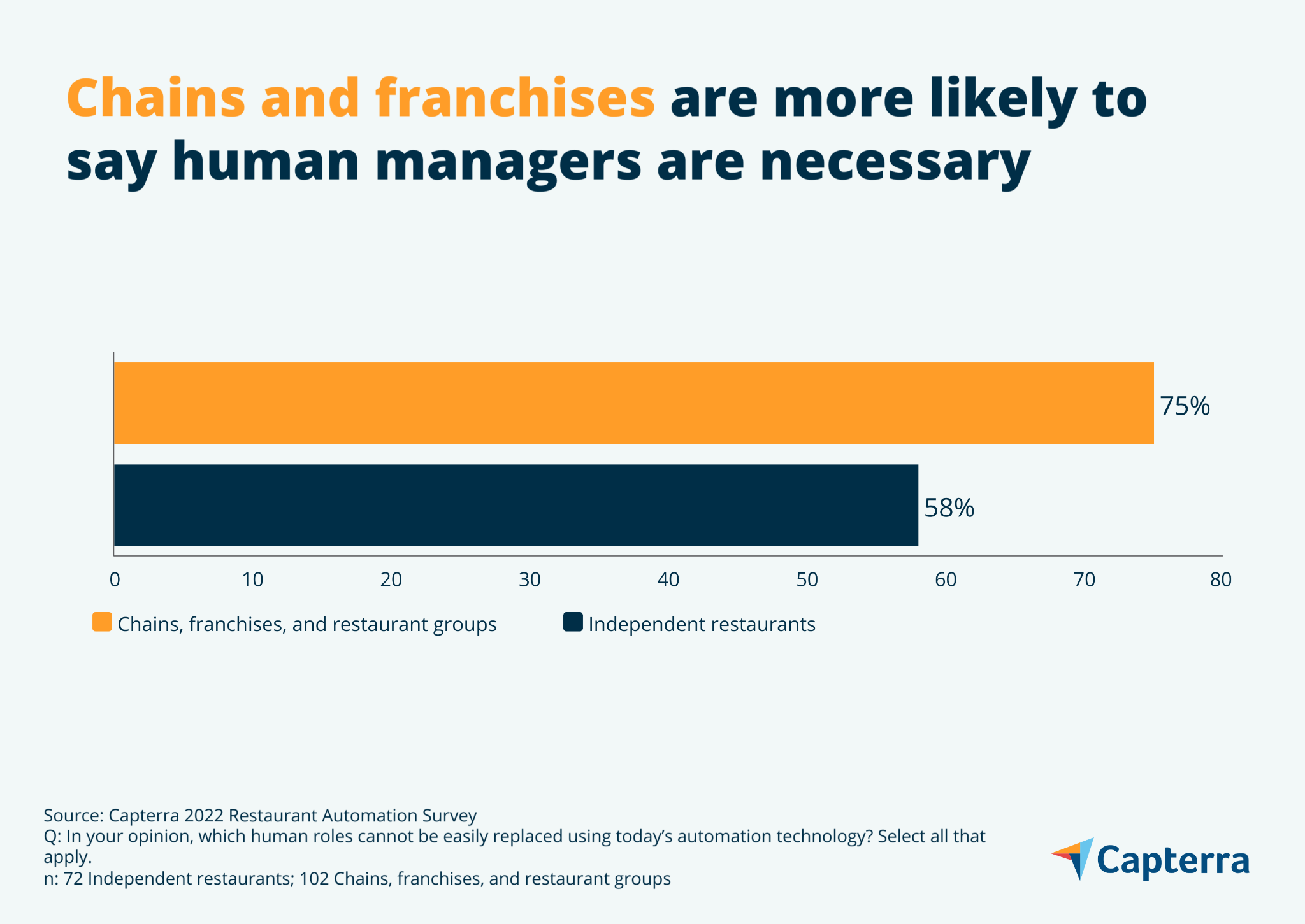 - Los gerentes son más importantes en las cadenas: el 75 % de los líderes de cadenas o franquicias de restaurantes dicen que el personal gerencial no se puede reemplazar fácilmente con la automatización, en comparación con solo el 58 % de los líderes de restaurantes independientes que dicen lo mismo.