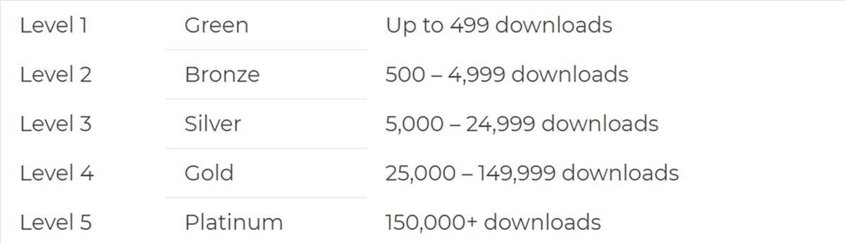 Este sitio web utiliza el modelo de reparto de ingresos "cuanto más vendes, más dinero ganas". Al principio, ganará una cantidad modesta por cada descarga, pero a medida que aumente su descarga, el valor de cada descarga también aumentará. Su contribución se basa en la cantidad de descargas y el tipo de descarga que haya realizado en los últimos 12 meses.