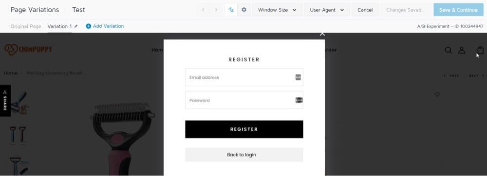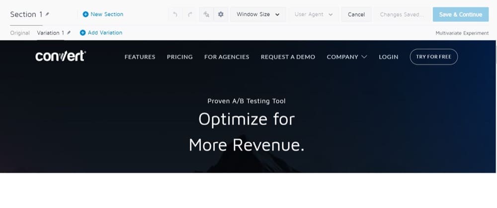 La URL de la página que desea probar se cargará en el Editor visual. Después de eso, puede editar la primera variación. Cambiar el contenido es tan simple como hacer clic en cualquier área resaltada en naranja. Al hacer clic en el signo más verde junto a los nombres de las variaciones, puede agregar nuevas variaciones.