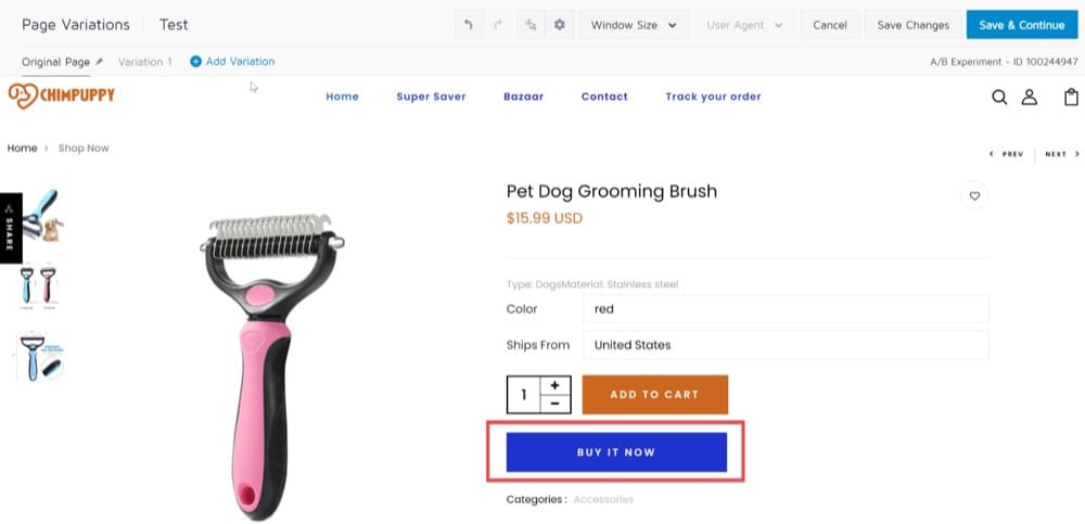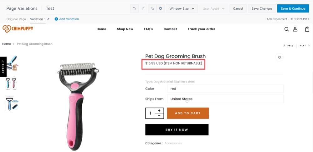 Cambiar el diseño de las páginas de sus productos para resaltar las funciones de recompensa, como una política de devolución gratuita y entrega gratuita, es un ejemplo de una prueba A/B que puede ejecutar.