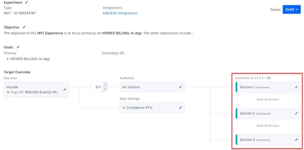 Hay secciones y variaciones en un MVT. Las secciones son las ubicaciones de su página donde desea probar una o varias variaciones.