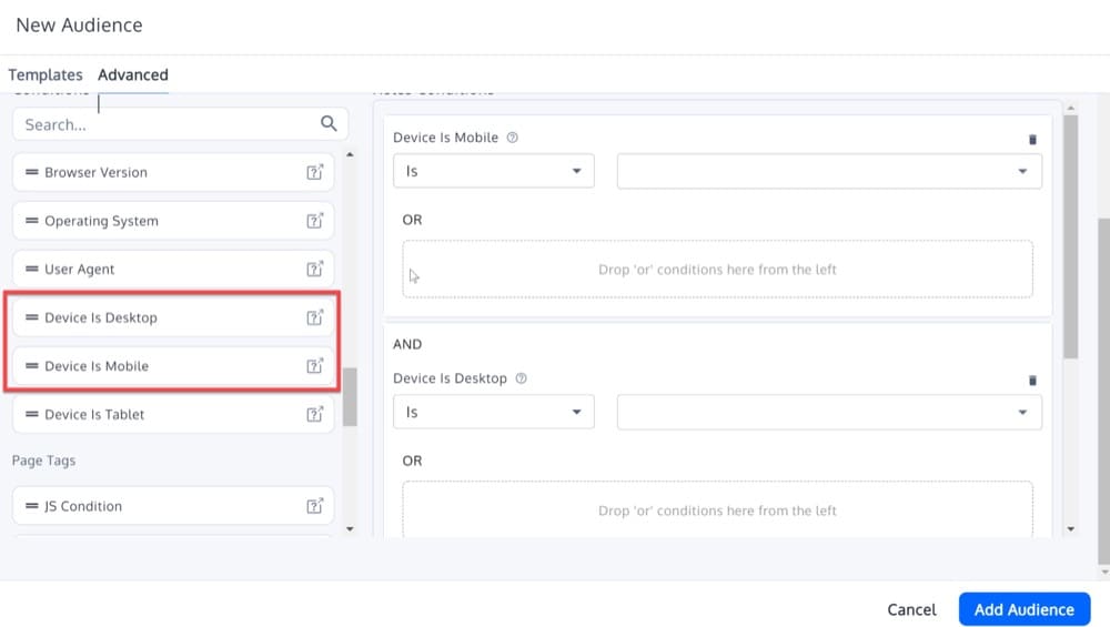 Para evitar la superposición de resultados y otros problemas de entrega de experiencia, debe ejecutar las pruebas anteriores en diferentes audiencias (por ejemplo, solo para dispositivos móviles o solo para computadoras de escritorio).