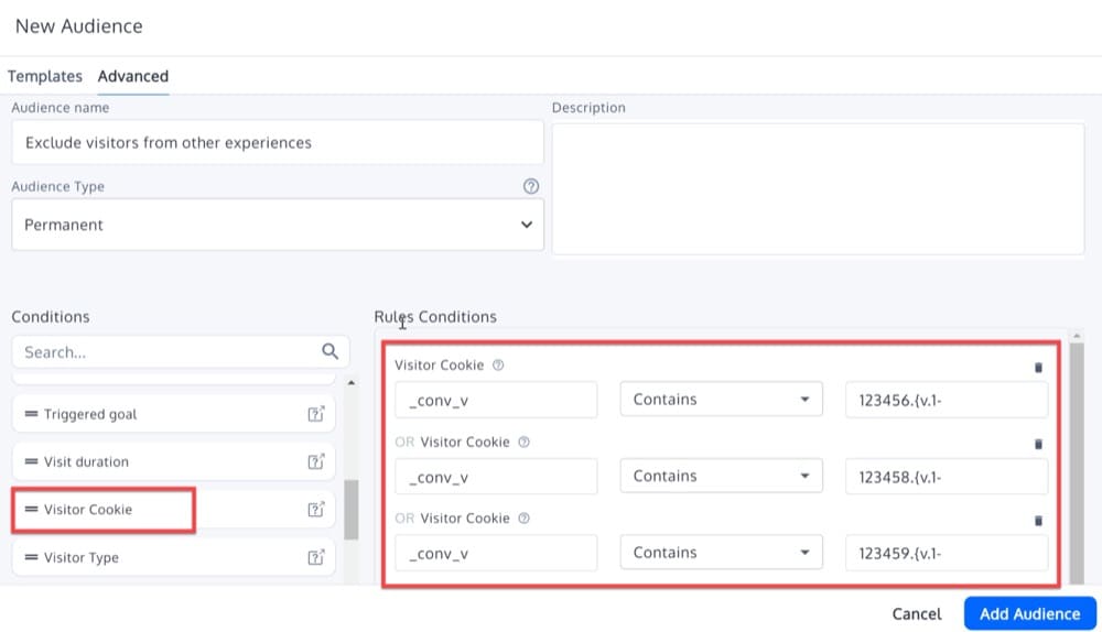 Luego, en todas las experiencias excepto la experiencia con el ID más bajo, use una Audiencia avanzada basada en cookies de visitantes para excluir a los visitantes que se han incluido en las otras experiencias paralelas.